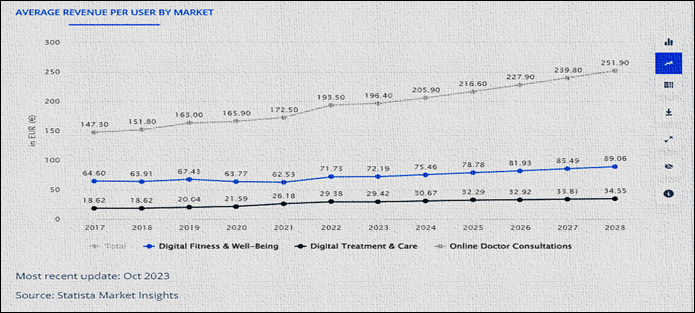 Statista. (2023, October). Average revenue per user (ARPU) in digital health markets worldwide from 2017 to 2028, by segment (in euros) [Chart]. https://www.statista.com/outlook/hmo/digital-health/digital-fitness-well-being/worldwide
